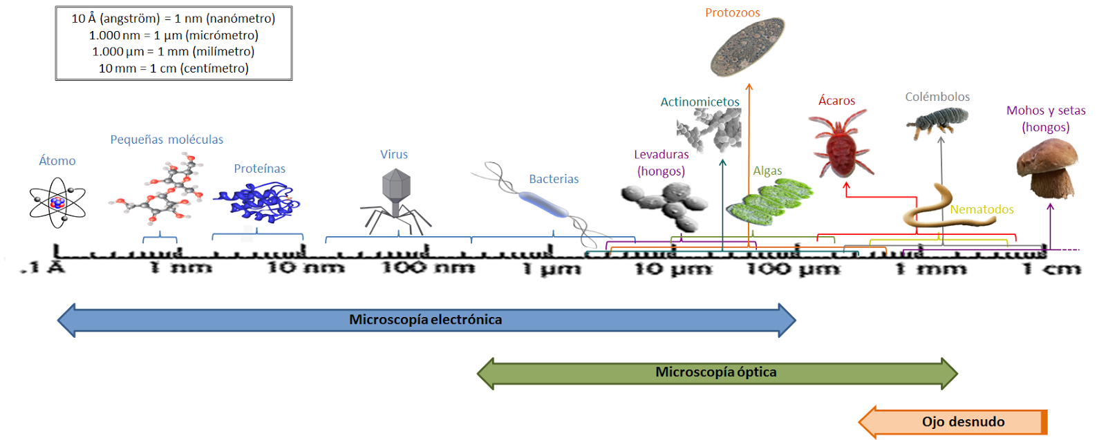 La disciplina que estudia los microorganismos es la Microbiología. Microorganismos solo pueden visualizarse con el microscopio cuando son solos pero podemos también visualizarlos con herramientos que permiten sus reproducciones (por ejemplo, en tubos que contienen solución de nutrientes). Microorganismos pueden ser bacterias, protozoos (por ejemplo amiba, Plasmodium [que causa causa el paludismo], trypanosomas y leishmania), hongos unicelulares y virus. Todos estos microorganismos son de diferentes tamaños: